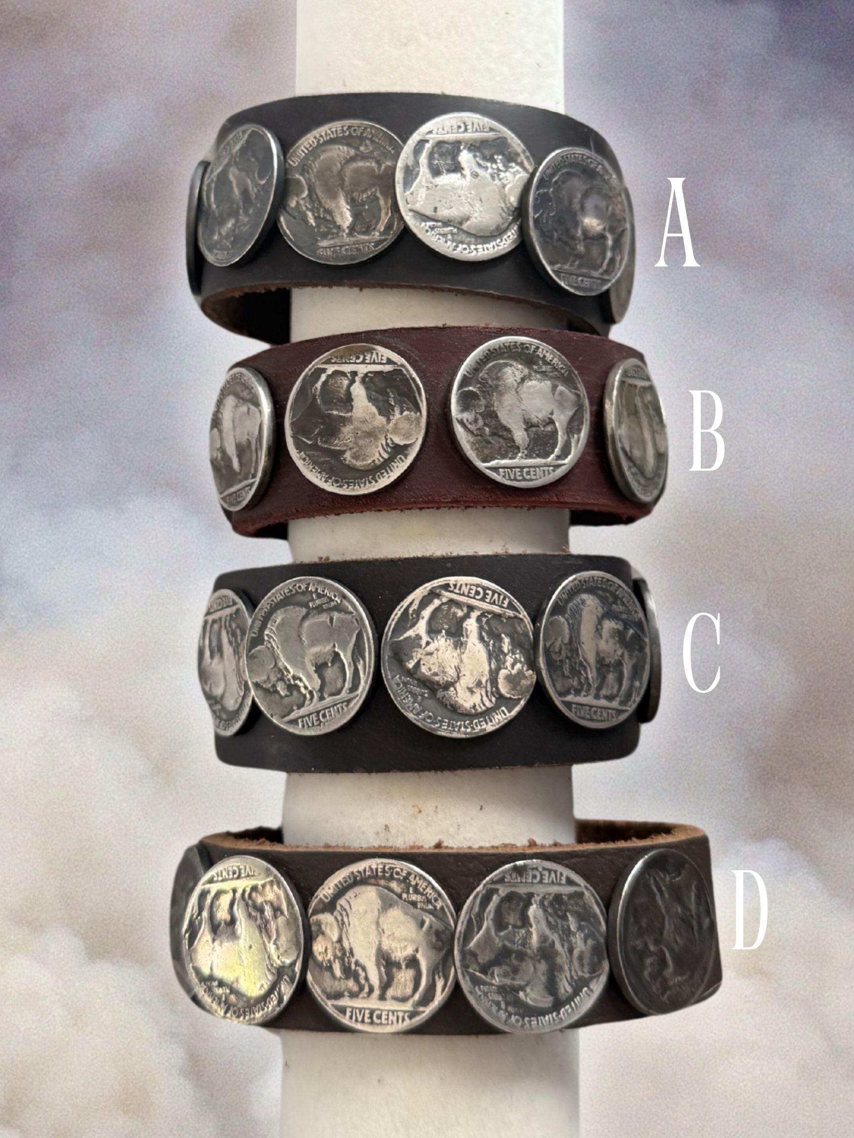 Vintage buffalo coin bracelets made with hand-cut leather bands. Find information + sizing info about each bracelet below!