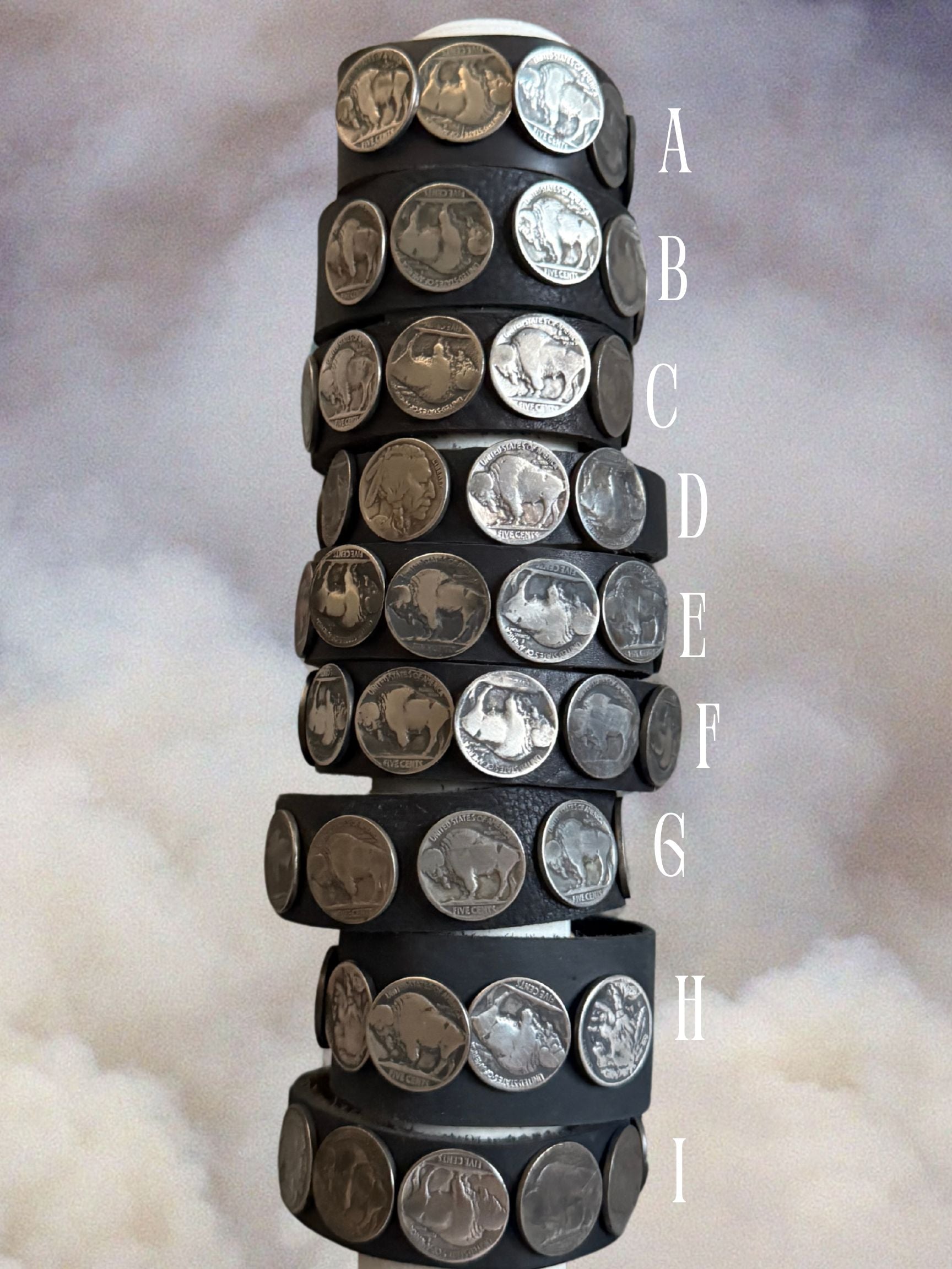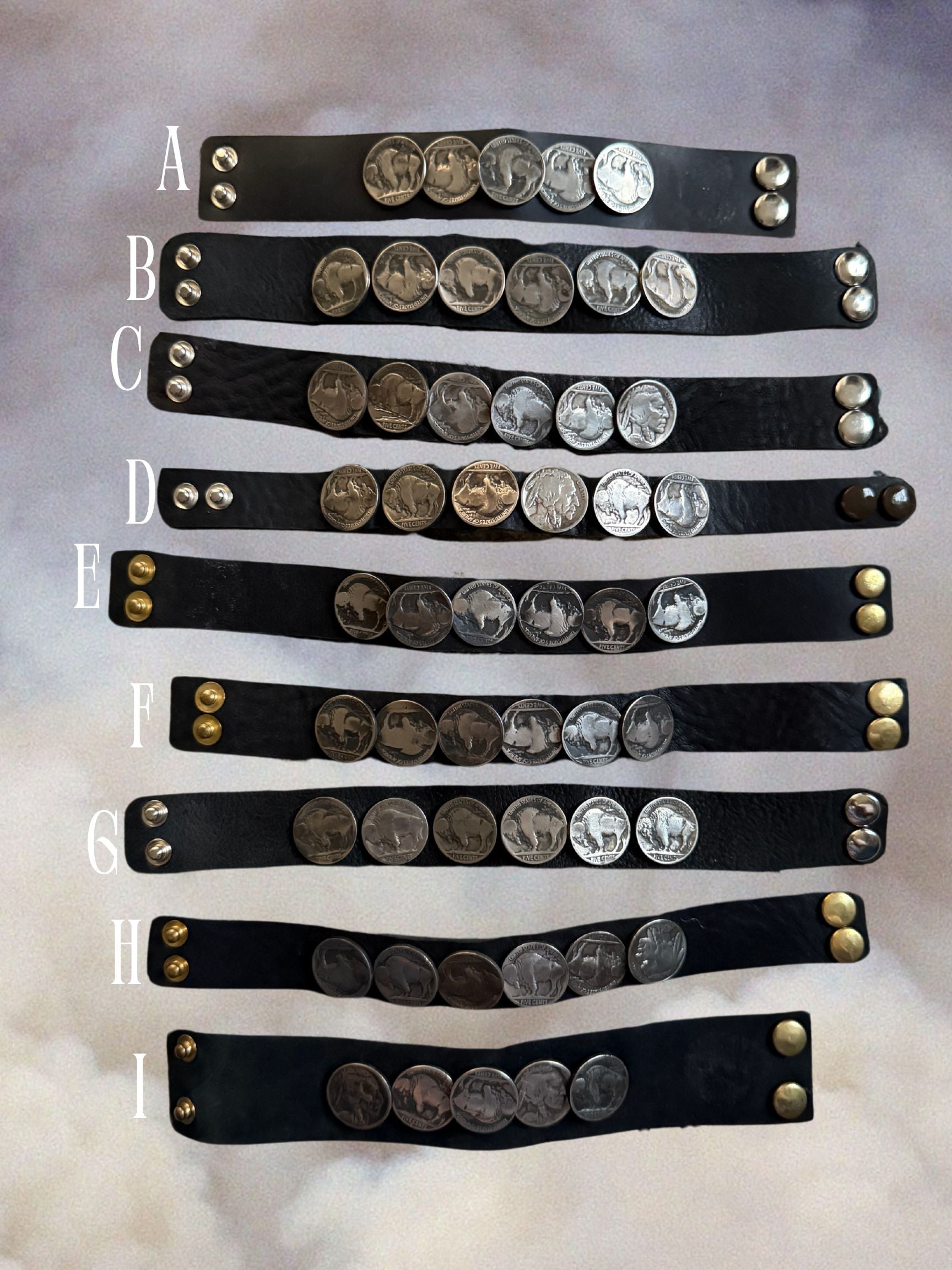 Vintage buffalo coin bracelets made with hand-cut black leather bands. Find information + sizing info about each bracelet below!
